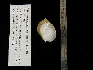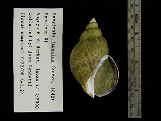 Today was a banner day in Nagoya for buccinid tissue sampling! I unpacked the snails that I collected and froze (*thank you for donating your lives to science*) from Rikuzen-Takata, Sendai, Joetsu, and Nagoya and put small slivers of their tissue into alcohol for DNA analysis back at UC Berkeley. My goal was to sample 25 different species and I already have 17. Conclusions, (1) Japanese people demand fresh tsubu gai at their fish markets and (2) species sold are not the same throughout Japan. This is very good for my research! Here is my hand holding one of the snails.